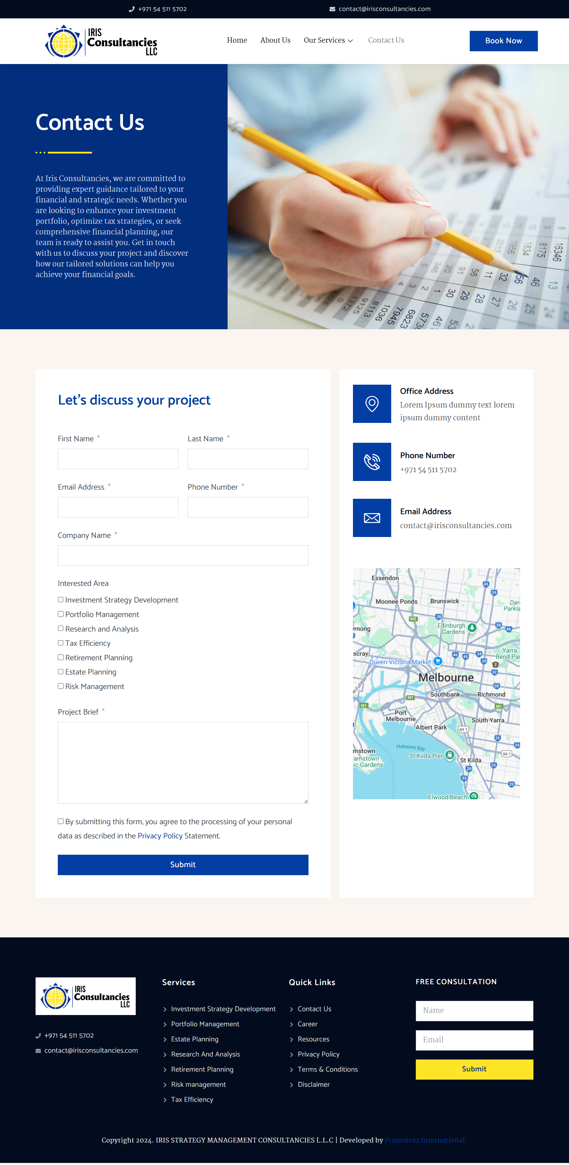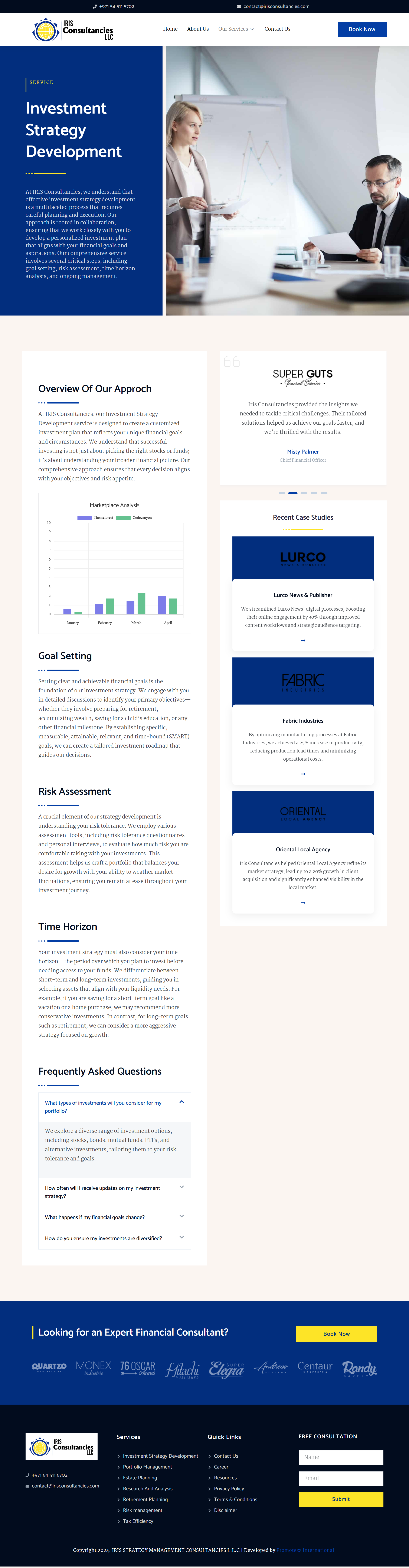The result is a polished, user-friendly online presence that builds trust, conveys professionalism, and strengthens their brand identity. It effectively positions Iris Consultancies as a reliable partner in the investment and financial consulting sector, helping them connect more meaningfully with potential clients while enhancing their competitive edge in the market.